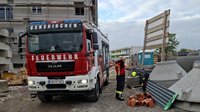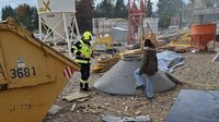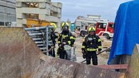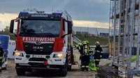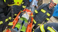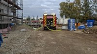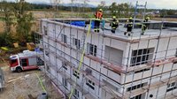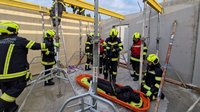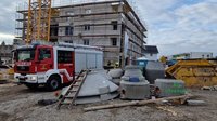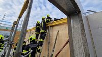 Weitere Kräfte führten eine schonende Personenrettung einer verletzten Person nach einem Bauunfall vom 3. Obergeschoss durch. Dies war aufgrund der zahlreichen Stützen und Schalungselemente eine Herausforderung.